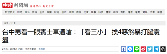【環球網報道】綜合“中時新聞網”和“三立新聞網”等台媒28日消息,台中市此前剛發生開瑪莎拉蒂富二代將與其發生擦撞事故的大學生打成重傷事件,不料台中又發生暴力事件,一顏姓男子本月18日晚走在路上要去買飲料時,路上突然被一輛奔馳車攔下並辱罵,車上另外3人隨即下車毆打顏姓男子,其中1人還拿棍棒攻擊,導致顏姓男子左耳膜破裂、眼睛瘀青及腦震盪。