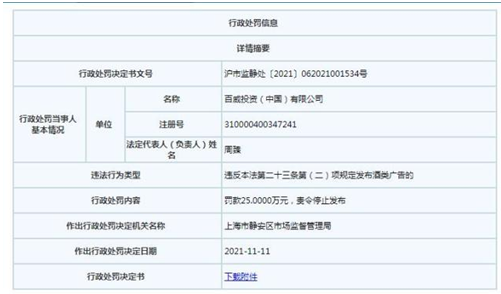【環球網財經消費資訊 記者 樊俊卿】11月23日,一條熱搜刷爆微博,短時間內斬獲過億閲讀,並引發網友大量討論。根據網絡公開消息顯示,近日,百威關聯公司百威投資(中國)有限公司因其發佈的廣告中出現“碰杯後的飲酒動作”,被上海市靜安區市場監督管理局處以25萬元人民幣的罰款。
