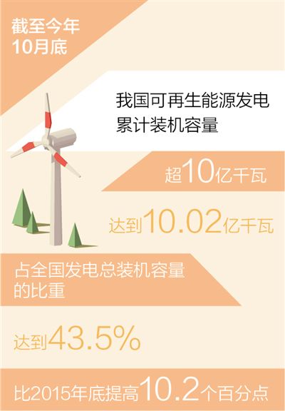 本報北京11月28日電 (記者丁怡婷)今年以來,我國可再生能源裝機規模穩步擴大,結出累累碩果。國家能源局近日發佈的數據顯示:截至今年10月底,我國可再生能源發電累計裝機容量超10億千瓦,達到10.02億千瓦,相當於40多個三峽電站的裝機容量,比2015年底實現翻番,佔全國發電總裝機容量的比重達到43.5%,比2015年底提高10.2個百分點。其中,水電、風電、太陽能發電和生物質發電裝機容量分別達到3.85億千瓦、2.99億千瓦、2.82億千瓦和3534萬千瓦,均穩居世界第一。