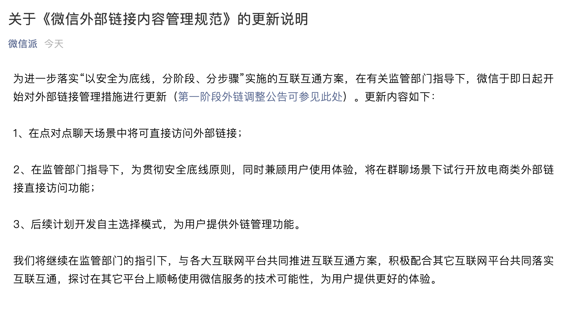 11月29日,微信發佈《關於〈微信外部鏈接內容管理規範〉的更新説明》,公佈在監管部門指導下進一步的互聯互通方案,點對點聊天場景中將可直接訪問外部鏈接,並將在羣聊場景試行開放電商類外部鏈接直接訪問功能。據悉,該功能將陸續生效。
