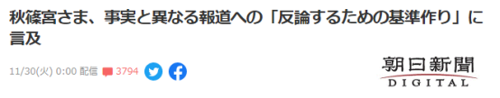 日本《朝日新聞》30日報道,11月30日是秋筱宮56歲生日,在25日舉行的生日記者會上,秋筱宮表示,針對女兒真子與小室圭成婚一事,多個日本雜誌的報道和網絡上的留言與事實相悖,並認為有必要設立“一定程度上的準則”,對違規言論進行反駁。
