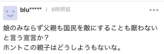 受到秋筱宮直接批評,大量日本網民擺出拒不接受的態度。有人稱:“不僅是女兒,就連父親也宣稱不惜以日本國民為敵嗎?這對父女真是無可救藥。”
