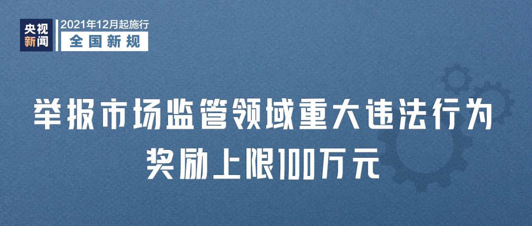 《市場監管領域重大違法行為舉報獎勵暫行辦法》12月1日起施行。舉報違反食品、藥品質量安全相關法律法規規定,嚴重危害人民羣眾人身、財產安全等重大違法行為,給予相應獎勵,每起案件的舉報獎勵金額上限為100萬元。