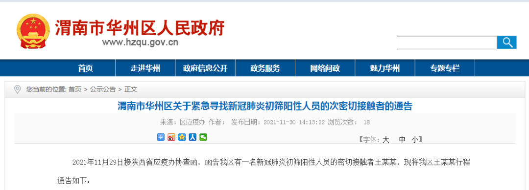 2021年11月29日接陝西省應疫辦協查函,函告我區有一名新冠肺炎初篩陽性人員的密切接觸者王某某 ,現將我區王某某行程通告如下:
