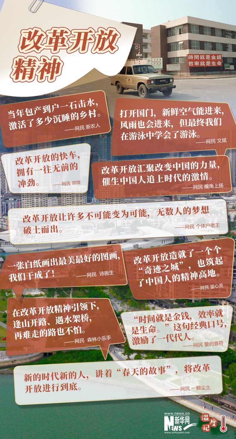 “在改革開放精神引領下,逢山開路、遇水架橋,再難走的路也不怕。”社交平台上,網民們點贊過往成就,對推動新時代更高水平的改革開放充滿信心。發揚偉大精神,沿着改革開放這條創造歷史的道路不斷奮進,鍥而不捨、一以貫之、再接再厲,我們必將開拓當代中國和中國人民新的更加宏闊的天地。(文字:馬若虎 海報設計:王曄)