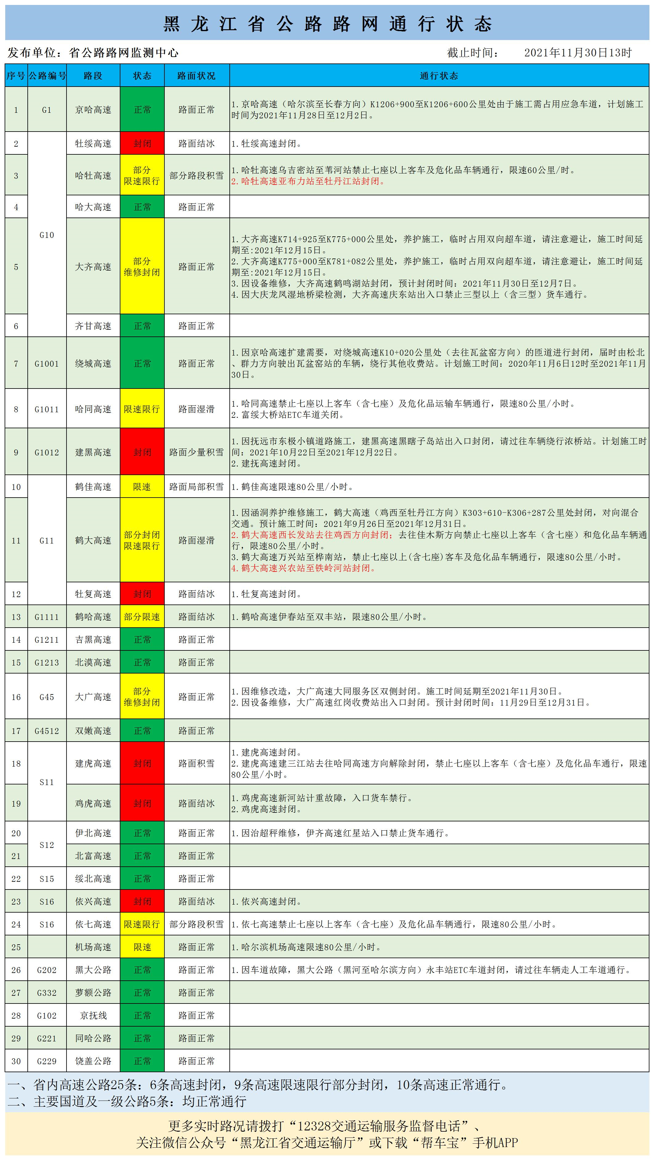 總枱記者從黑龍江省高速公路部門瞭解,截至11月30日13時,黑龍江省內25條高速公路,其中6條高速公路處於封閉狀態,9條高速限速限行部分封閉,10條高速正常通行。