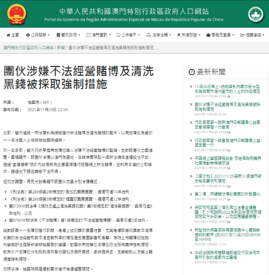 澳門特別行政區政府此前重申,所有在澳從事博彩業的人員都必須嚴格遵守國家和澳門有關的法律規定,對於涉嫌違反澳門法律規定的行為,將依法追究、絕不姑息。
