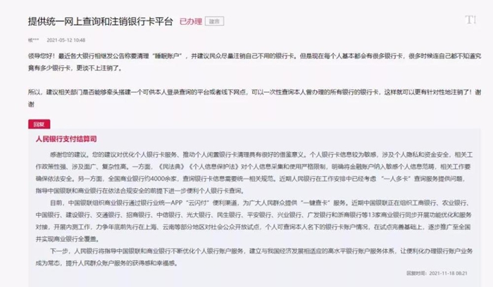 人民銀行表示,個人銀行卡信息較為敏感,涉及個人隱私和資金安全,相關工作政策性強、涉及面廣、複雜性高。一方面,《民法典》《個人信息保護法》對個人信息採集和使用嚴格限制,明確將金融賬户納入敏感個人信息範疇,相關工作要確保依法安全。另一方面,全國商業銀行約4000餘家,查詢銀行卡信息需要統一相關規範。近期在工作安排中已經考慮“一人多卡”查詢服務提供問題,指導中國銀聯和商業銀行在依法合規安全的前提下進一步便利個人銀行卡查詢。