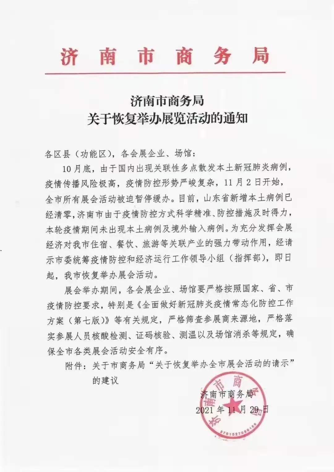 山東省濟南市商務局經請示濟南市委統籌疫情防控和經濟運行工作領導小組(指揮部)後下發通知,即日起,濟南市恢復舉辦展會活動。