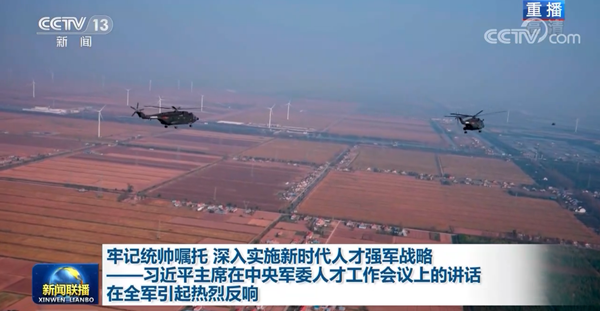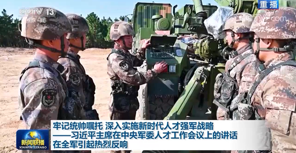 央視網消息 (新聞聯播):中共中央總書記、國家主席、中央軍委主席習近平在中央軍委人才工作會議上強調,聚焦實現建軍一百年奮鬥目標,深入實施新時代人才強軍戰略。廣大官兵表示,要始終牢記統帥囑託,以強烈的使命感、責任感,聚焦備戰打仗,聚力轉型升級,全面實施新時代人才強軍戰略,加快推進軍事人員現代化,奮力為實現建軍一百年奮鬥目標、把人民軍隊建設成為世界一流軍隊提供堅實人才支撐。