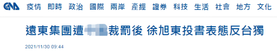 台媒:台遠東集團在大陸被依法查處後,董事長徐旭東投書表態反對“台獨”