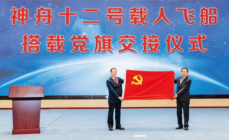 2021年11月4日,神舟十二號載人飛船搭載黨旗交接儀式在中國共產黨歷史展覽館紅色大廳舉行。 新華社記者 才揚/攝