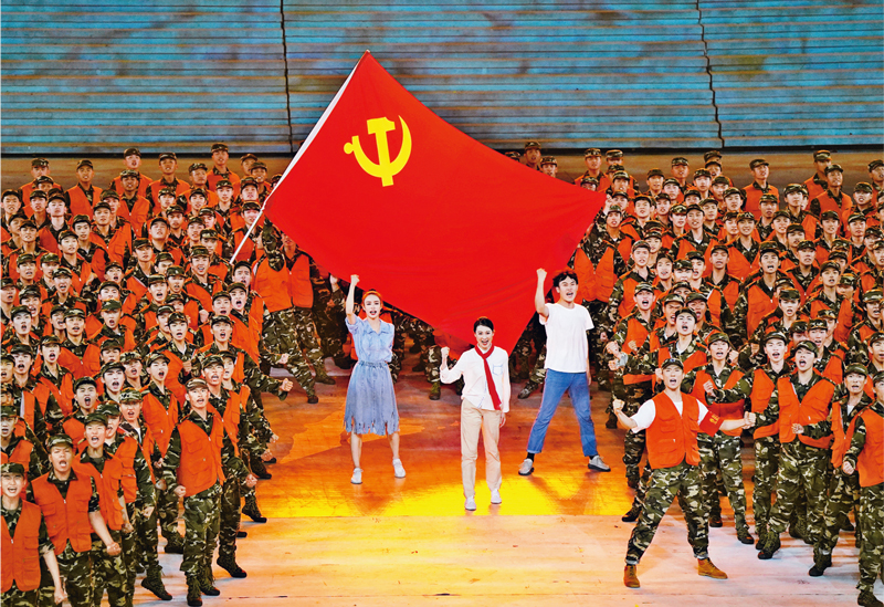 2021年6月28日晚,慶祝中國共產黨成立100週年文藝演出《偉大征程》在國家體育場盛大舉行。這是情景舞蹈《黨旗在我心中》。 新華社記者 殷博古/攝