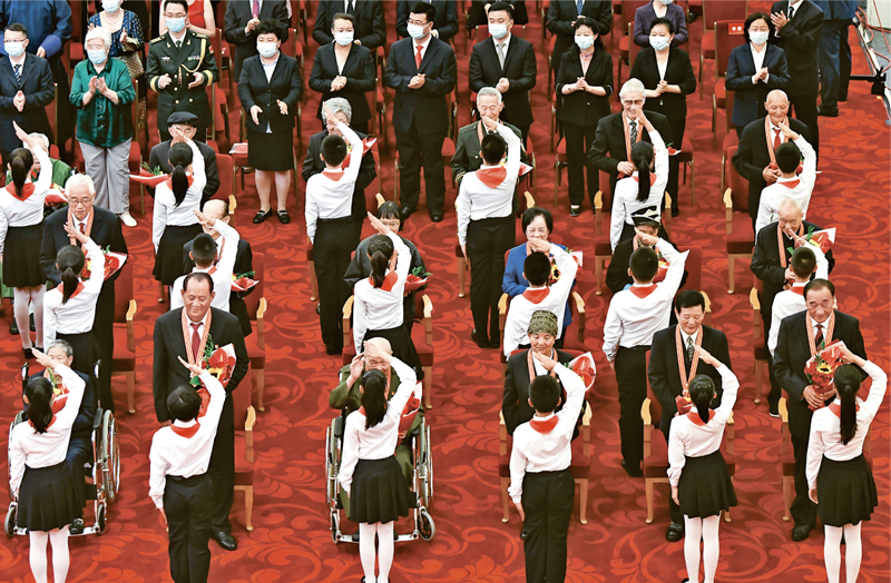 2021年6月29日,慶祝中國共產黨成立100週年“七一勳章”頒授儀式在北京人民大會堂金色大廳隆重舉行。這是少先隊員向勳章獲得者獻花,敬禮致意。 新華社記者 高潔/攝