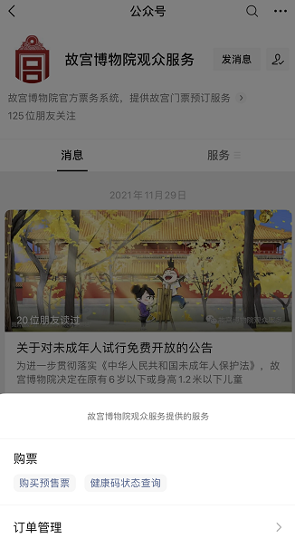 搜索關注“故宮博物院觀眾服務”微信公眾號。