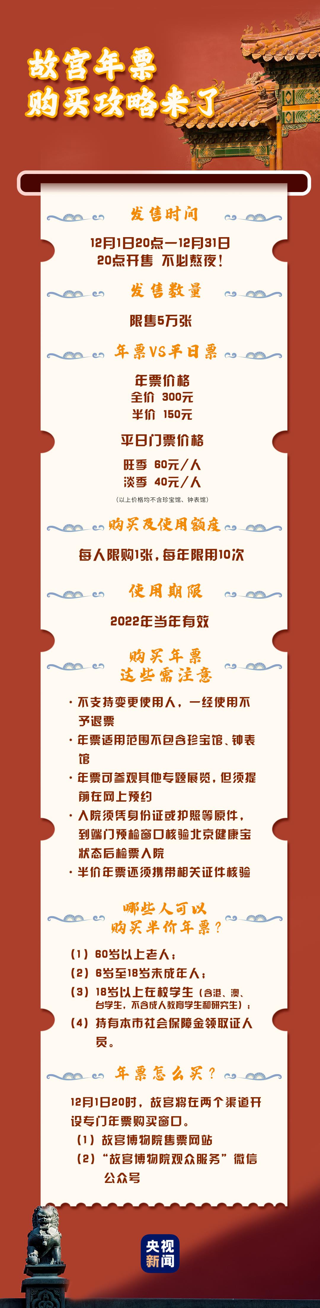 12月3日20時起,可通過故宮博物院售票網站、“故宮博物院觀眾服務”微信公眾號預約12月10日以後的未成年人免費門票(含珍寶館、鐘錶館)。