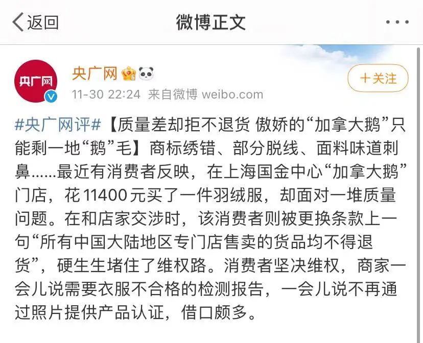 12月1日早間,#加拿大鵝規定中國大陸門店不得退貨#登上微博熱搜。