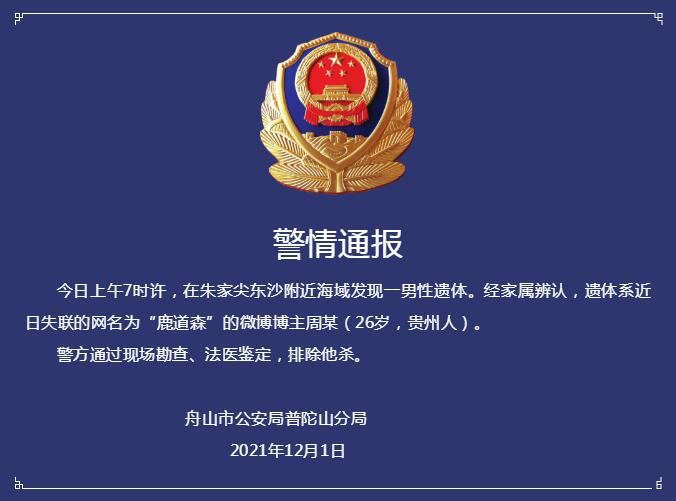 今日上午7時許,在朱家尖東沙附近海域發現一男性遺體。經家屬辨認,遺體系近日失聯的網名為“鹿道森”的微博博主周某(26歲,貴州人)。