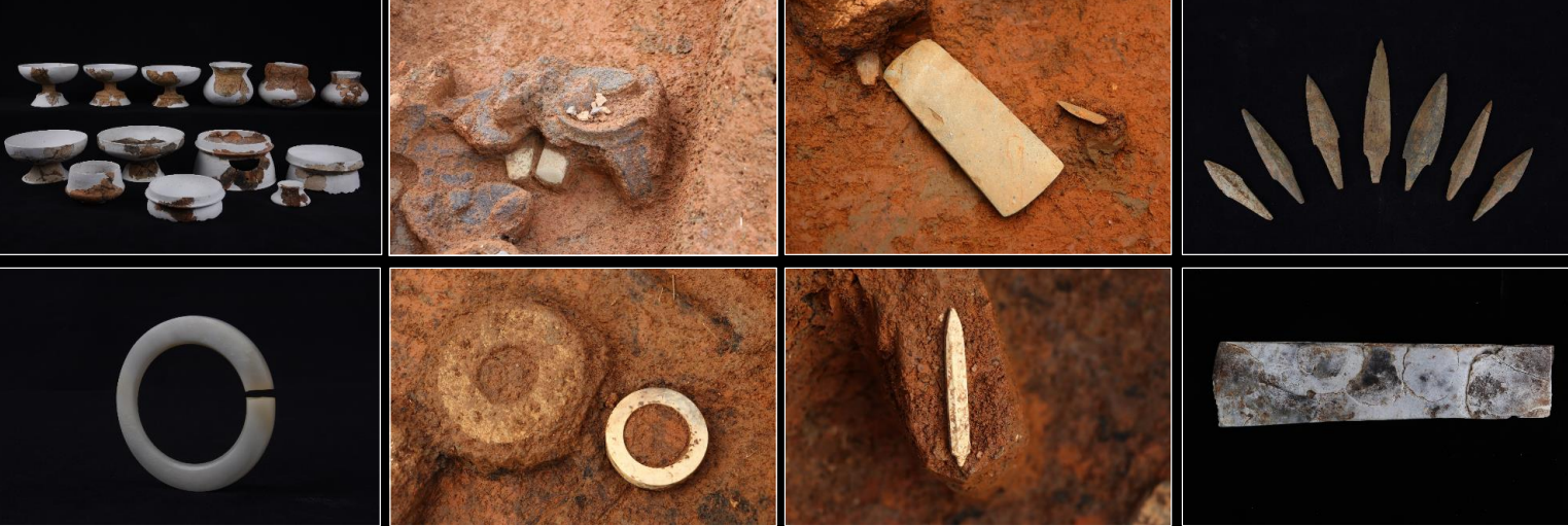 巖山寨遺址總面積約5萬平方米,包含居住區、墓葬區等多個功能區。居住區發現大量灰坑、柱洞,也夾雜少量墓葬,居住生活和喪葬並未完全分開。墓葬區共發掘墓葬66座,可見一次葬、二次葬和遷出葬現象,少數墓葬保存了木質葬具殘痕與人骨遺存,這在嶺南同類遺址中極為罕見。隨葬陶器組合以鼎、盤、豆、壺、罐為主,磨製石器以鏃、錛為主,玉器有琮、鉞、環、玦、璧、錛、錐形器及圭形器等,以玉鉞為最大宗。墓葬形制、喪葬禮俗及隨葬器物組合都具有顯著的石峽文化特徵。墓葬表現出明顯的等級分化,高等級墓葬普遍隨葬玉器,其中M16隨葬品超過140件,包括5件玉鉞與2件玉環,M26則同時隨葬有玉琮與玉鉞。