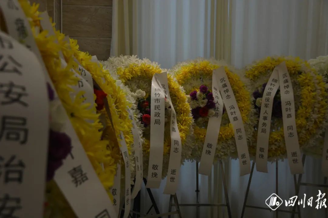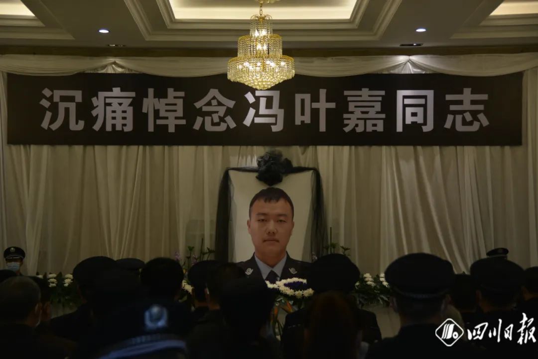 12月1日上午8點,綿竹市殯儀館牡丹廳莊嚴肅穆,一副黑底白字的輓聯垂掛兩旁,馮葉嘉同志悼念儀式在此舉行。德陽市、綿竹市兩地公安民警,以及馮葉嘉生前戰友、同事、親友等數百人前來送他最後一程。11月22日21時許,綿竹市公安局特巡警大隊輔警馮葉嘉,在跳水勇救輕生女子過程中不幸殉職,年僅28歲。