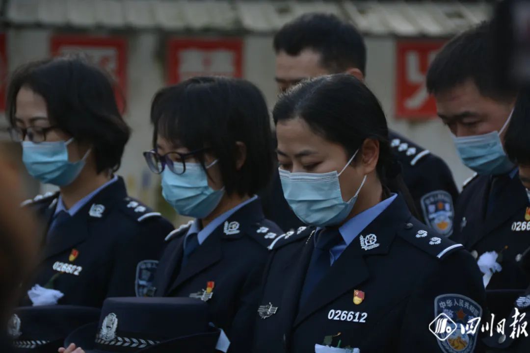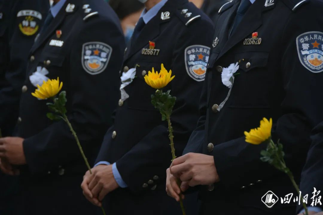 在告別儀式現場,德陽各地公安民輔警、羣眾胸戴白花,淚別好戰友、好輔警。