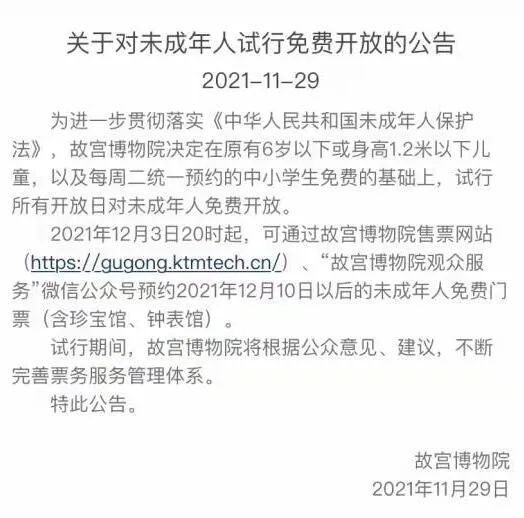 故宮宣佈,將對未成年人免費開放!