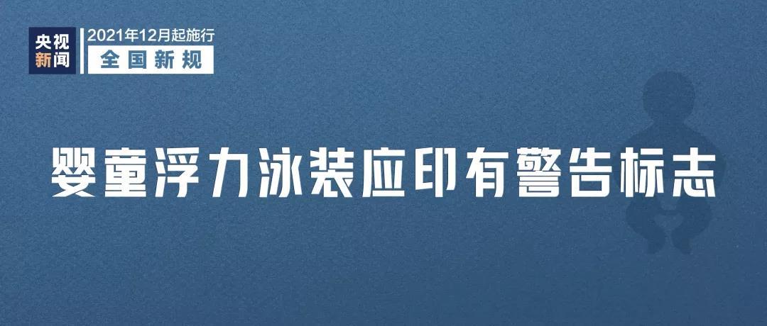 《嬰童浮力泳裝》國家標準12月1日起實施。明確嬰童浮力泳裝的結構與浮力性能等水中安全性要求,應在耐久性標籤上或產品的顯著位置印刷或壓印警告標誌等。