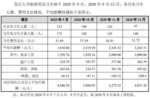 另外,瑜欣電子招股書還透露,公司存在大量使用實習生的情況,2020年9月,瑜欣電子當月實習生計薪人數高達175人,但基本工資僅1299.76元,是當地最低工資標準1800元的72%。