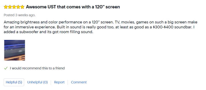一位在百思買網站購買了120英寸海信三色激光電視的美國用户給這款產品打了5星好評,並在留言中寫道:這台超大的120 英寸的屏幕,亮度和色彩表現無與倫比,效果驚人。無論是看電視、電影還是玩遊戲都可以獲得極致的沉浸式體驗,並且內置的聲音效果極佳。