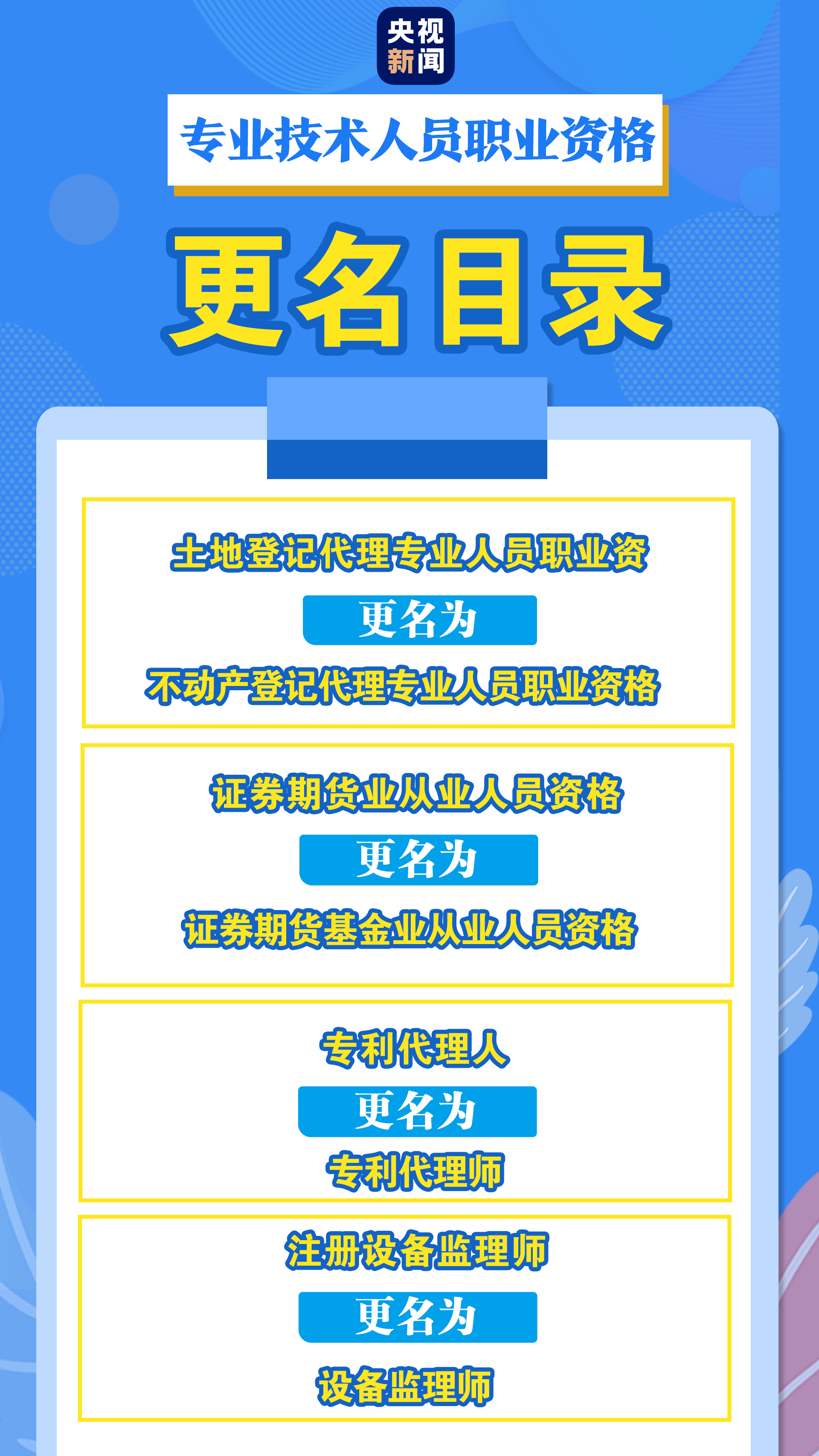 將“註冊設備監理師”由准入類調整為水平評價類,更名為“設備監理師”;“專利代理人”更名為“專利代理師”;“土地登記代理專業人員職業資格”更名為“不動產登記代理專業人員職業資格”;“證券期貨業從業資格”更名為“證券期貨基金業從業資格”等。