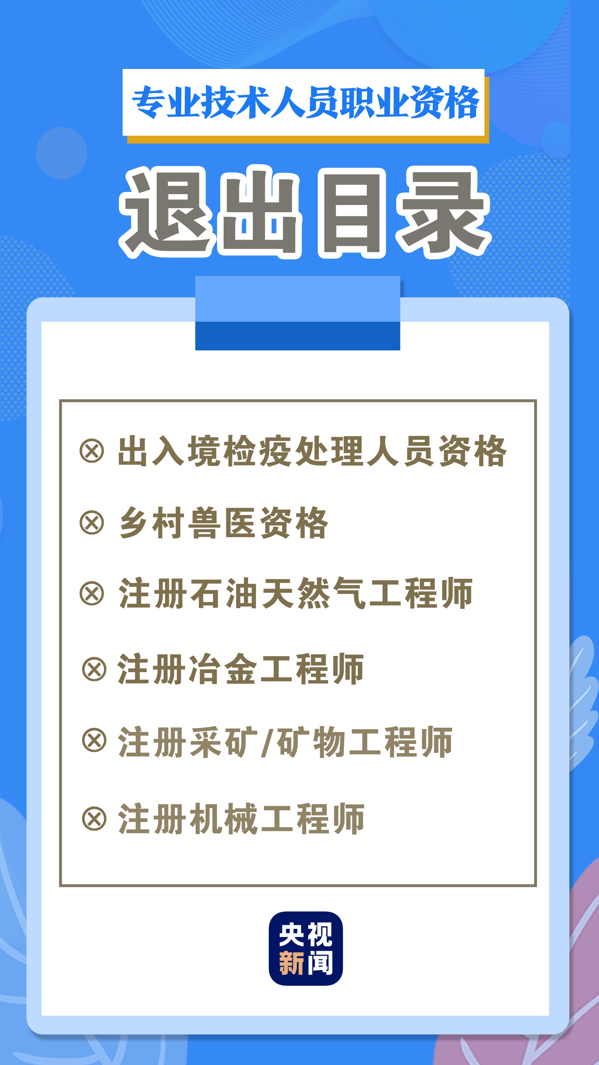 “出入境檢疫處理人員資格”“鄉村獸醫資格”和勘察設計註冊工程師下的“註冊石油天然氣工程師”“註冊冶金工程師”“註冊採礦/礦物工程師”“註冊機械工程師”退出目錄,從業人員依據行業標準開展技術活動。