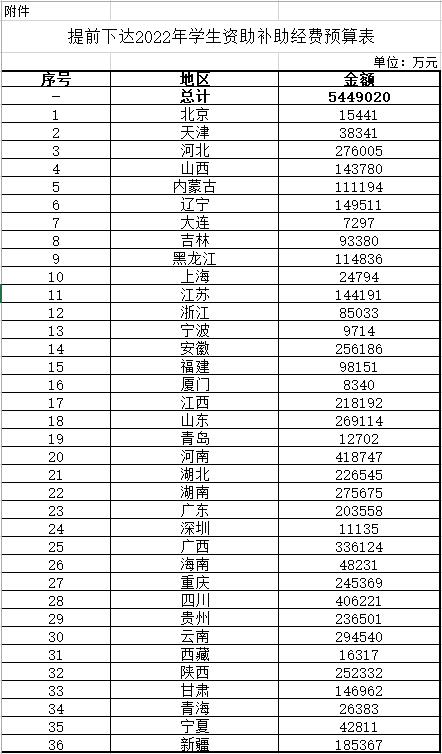 三部門提前下達2022年學生資助補助經費預算5449020萬元