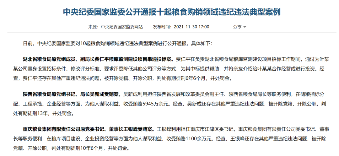 中央紀委國家監委網站 陸麗環報道 11月30日,中央紀委國家監委公開通報10起糧食購銷領域違紀違法典型案例,充分彰顯了黨中央堅定不移推進黨風廉政建設和反腐敗鬥爭的堅強決心和堅定意志,釋放了“莫伸手、伸手必被捉”的強烈信號。