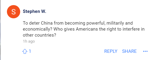 對於這篇報道,有網友留言表示:“阻止中國在軍事和經濟上變得強大?誰賦予美國人干涉別國的權利?