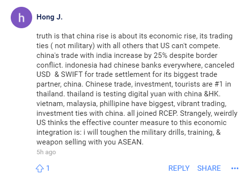 還有網友更深入點出:“事實是,中國的崛起是關於他的經濟崛起,他與所有其他國家的貿易關係(不是軍事),美國無法競爭。儘管存在邊界衝突,中國與印度的貿易仍增長了25%。印尼到處都有中國的銀行,印尼取消了美元和SWIFT進行貿易結算,為其最大的貿易伙伴,中國。中國的貿易、投資、遊客在泰國排名第一。泰國正在與中國及中國香港測試數字人民幣。越南、馬來西亞、菲律賓與中國有最大、最活躍的貿易和投資關係。他們都加入了RCEP。奇怪的是,美國認為應對這種經濟一體化的有效對策是:我將加強和你東盟的軍事演習、訓練及武器銷售。”