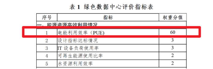 根據六部門發佈的通知,要求各地依據《綠色數據中心評價指標體系》,在生產製造、電信、互聯網、公共機構、能源、金融、電子商務等數據中心重點應用領域,進行數據中心的推薦。在評價指標表中,電能利用效率(PUE)所佔權重達60%,成為綠色數據中心評價中最重要的一項指標。
