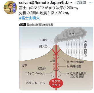 “富士山岩漿積攢在底下20千米,之前兩次地震的深度也是20千米”