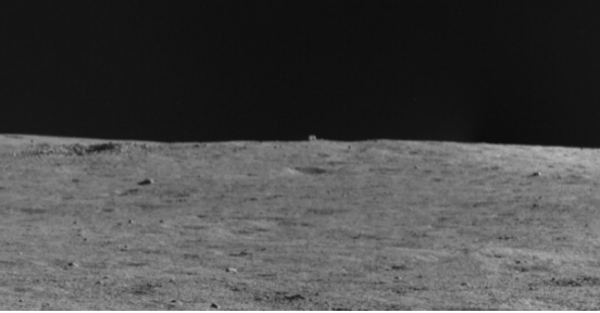 在月晝下午一路翻山越嶺的探險之餘,駕駛員們沒忘了看看風景,他們操控玉兔二號對周圍的天際線實施了環拍。這是 玉兔二號落月後首次抬頭環視四周, 只見黝黑深邃的天空下,一圈曲折蜿蜒的山脈矗立在天月延展線上,給天與月的邊界鑲嵌上一圈層巒疊嶂的鎖邊,讓人不禁讚歎宇宙的鬼斧神工。駕駛員們將圖片放大,一格一格慢慢欣賞。