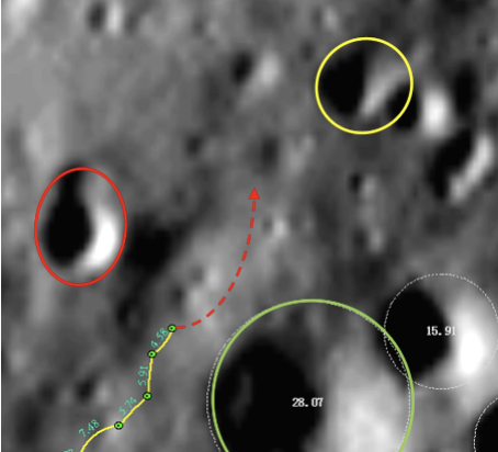 迎接它的第一個挑戰就是當前的複雜地形:東側大型撞擊 坑密佈,形成了C型包圍;西北方則是隆起坡度高達10°的羣嶺搭配兩個撞擊坑,它們將玉兔二號牢牢地限制在“夾縫”中。