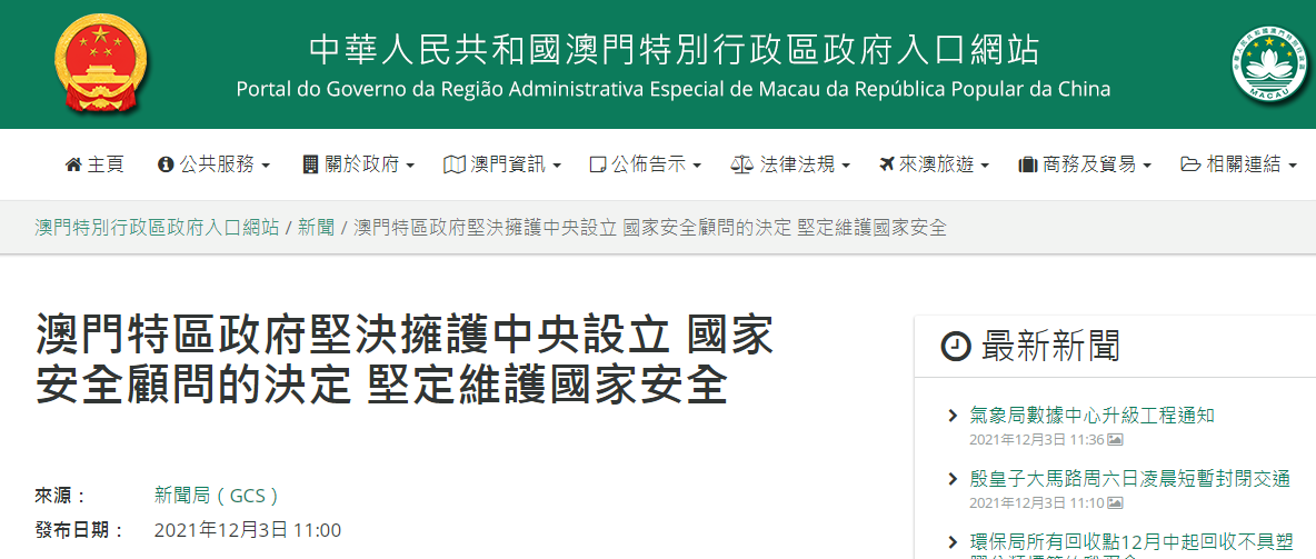 澳門特區政府:堅決擁護中央設立國家安全顧問的決定,堅定維護國家安全