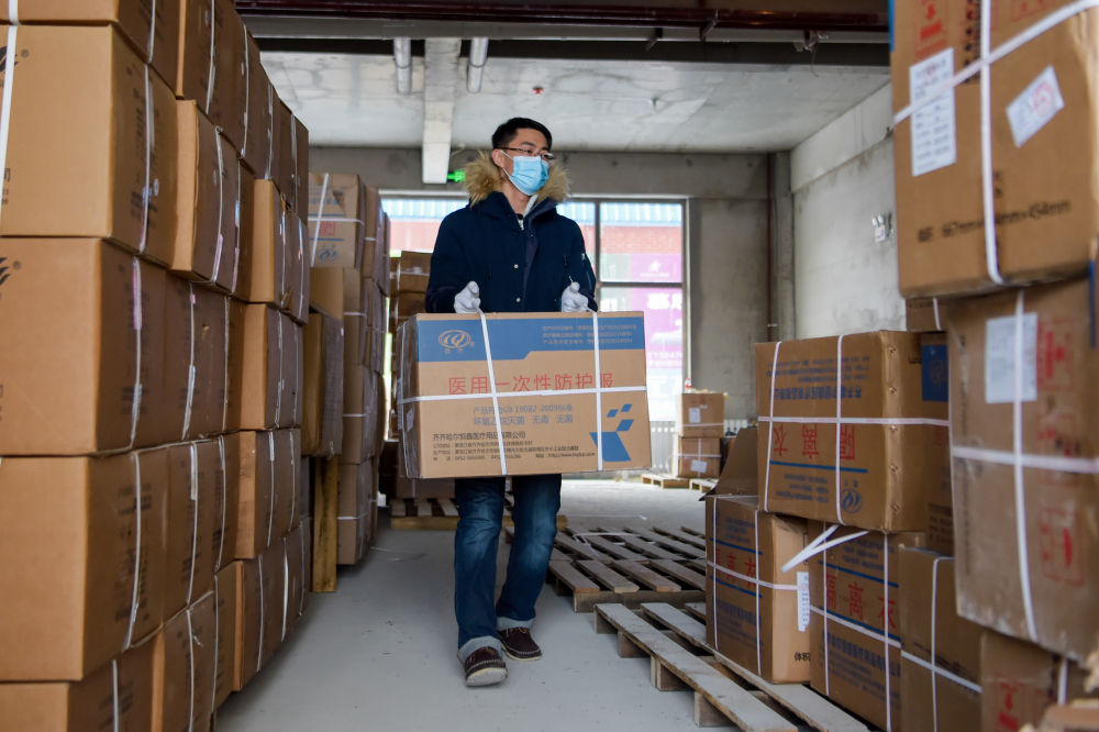 在位於滿洲里市臚臏社區的臨時物資存放點,工作人員在搬運防疫物資。新華社記者 李志鵬 攝