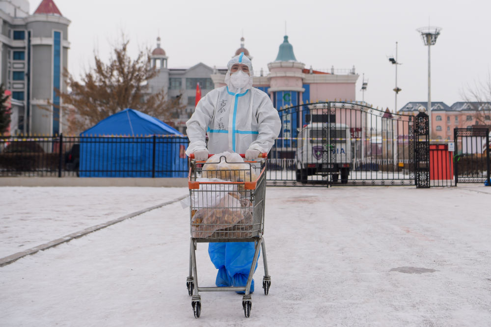 在滿洲里市府欣小區,工作人員運送物資。新華社記者 李志鵬 攝