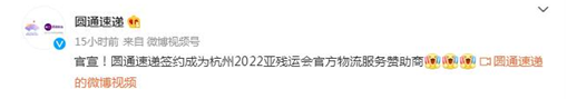 【環球網財經消費資訊記者 樊俊卿】12月2日,圓通速遞通過官方微博賬號宣佈,該公司已與杭州2022年第四屆亞殘運會組委會簽約,成為杭州2022亞殘運會官方物流服務贊助商。