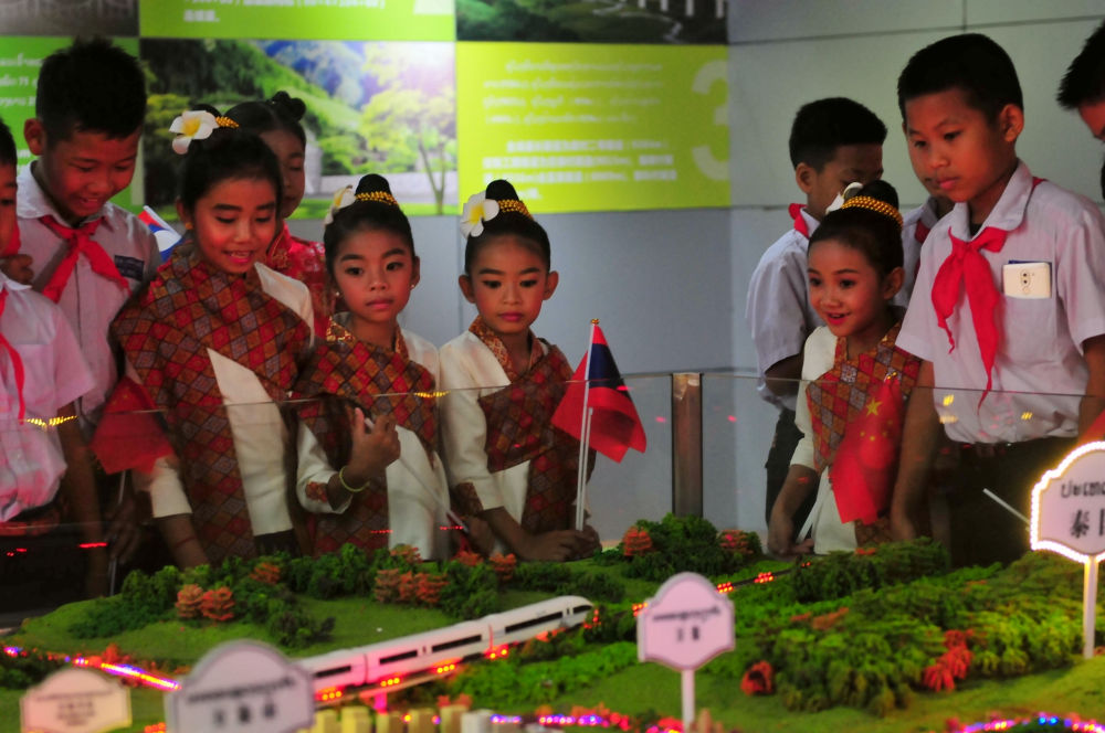 2019年6月1日,在老撾萬象,中老友好農冰村小學學生參觀中老鐵路展示館。新華社記者 章建華 攝