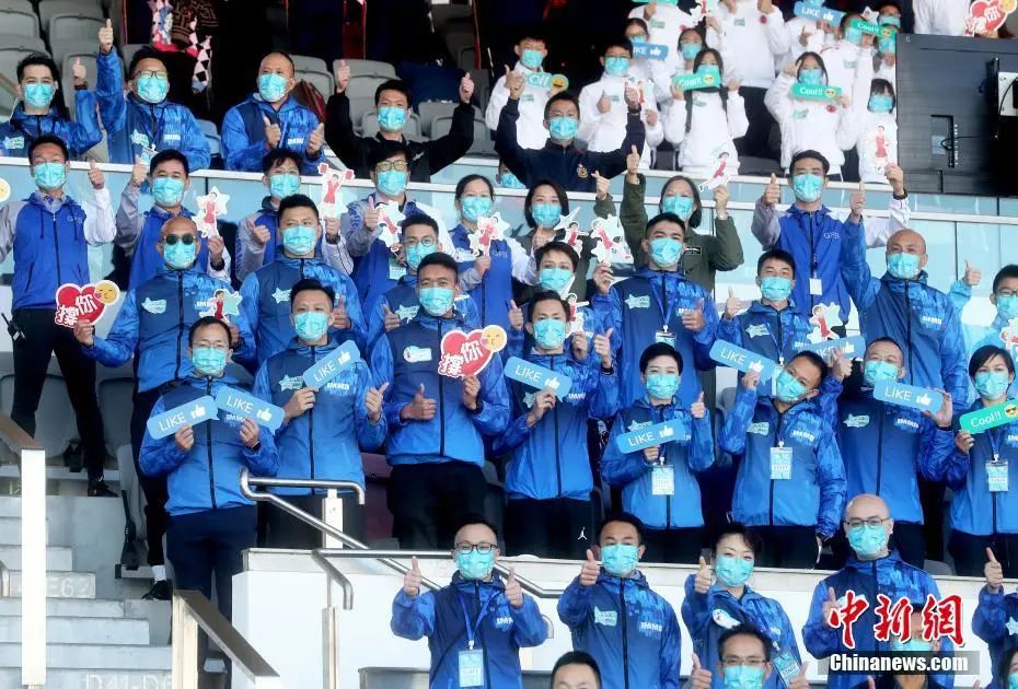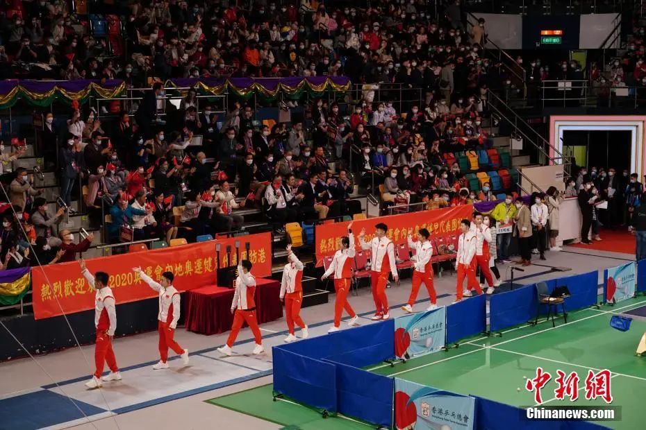 12月4日上午,內地奧運健兒代表團的部分運動員來到香港伊利沙伯體育館,向現場觀眾示範表演體操、蹦牀、羽毛球、擊劍、乒乓球等項目。圖為內地奧運健兒向現場觀眾揮手致意。中新社記者 張煒 攝