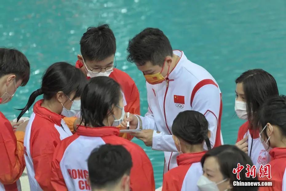 12月4日上午,內地奧運健兒代表團的部分運動員來到香港銅鑼灣維多利亞公園游泳池,向現場觀眾示範表演跳水及游泳運動,展示奧運健兒風采。圖為跳水運動員王宗源為香港運動員簽名。中新社記者 李志華 攝