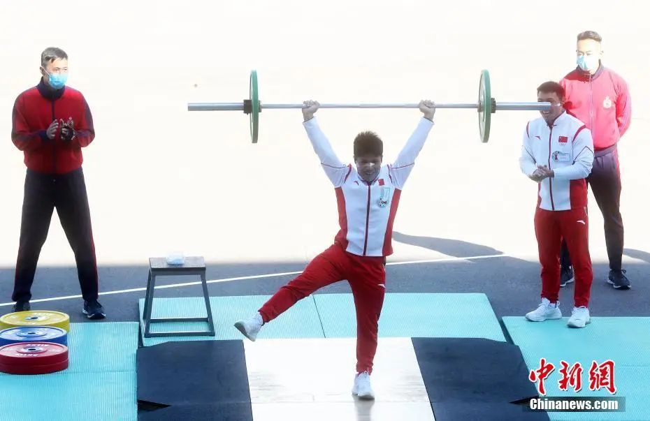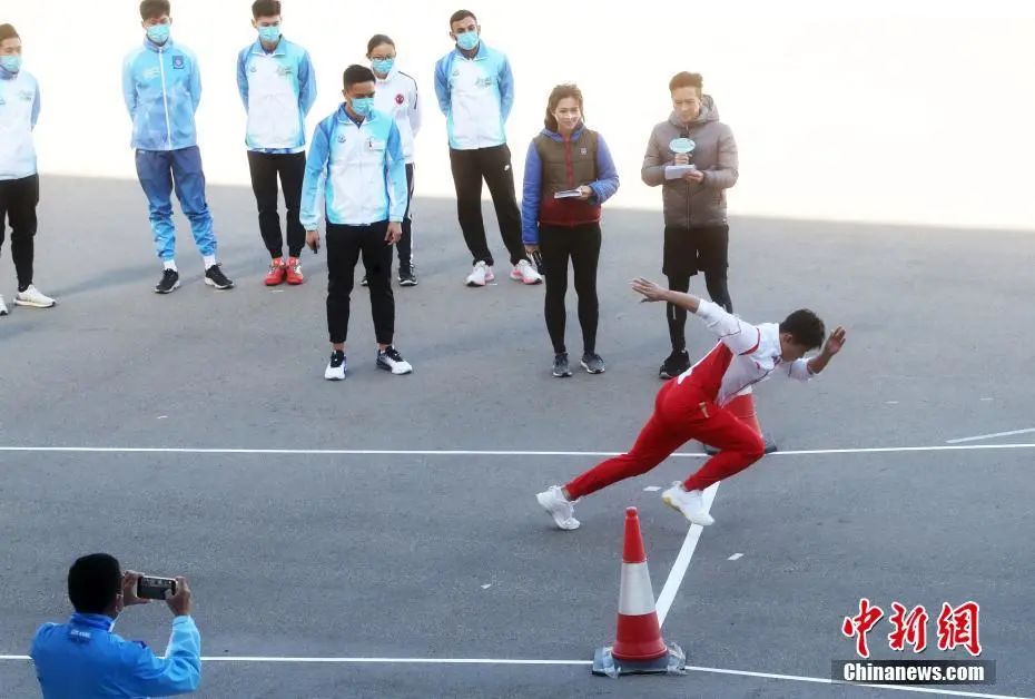 12月4日,內地奧運健兒訪港代表團部分運動員在香港消防及救護學院,與香港紀律部隊成員交流。圖為李發彬再秀“金雞獨立”。中新社記者 張宇 攝