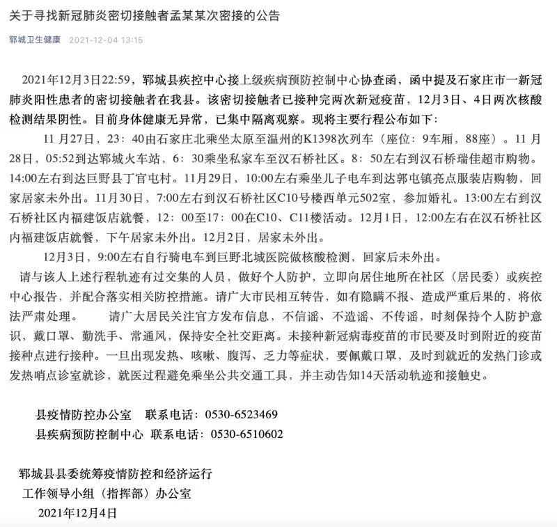 12月3日22:59,菏澤鄆城縣疾控中心接上級疾病預防控制中心協查函,函中提及石家莊市一新冠肺炎陽性患者的密切接觸者在鄆城縣。該密切接觸者已接種完兩次新冠疫苗,12月3日、4日兩次核酸檢測結果陰性。目前身體健康無異常,已集中隔離觀察。現將主要行程公佈如下: