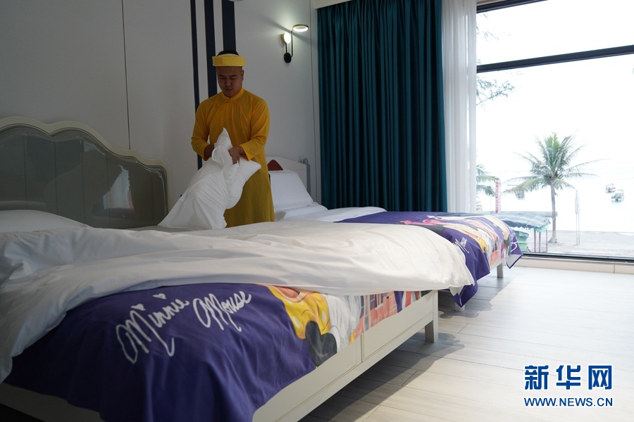 冬日的金灘,海風拂面,陽光輕柔。一大早,京族小夥蘇運晟就在自家的民宿裏收拾打掃。現在雖不是旅遊旺季,但週末即將到來,仍會有不少遊客自駕來金灘旅遊。