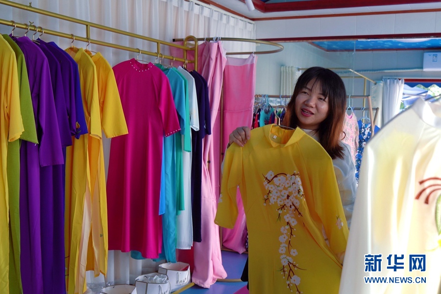 陳瑩瑩在店裏展示京族服裝。新華網 劉君 攝